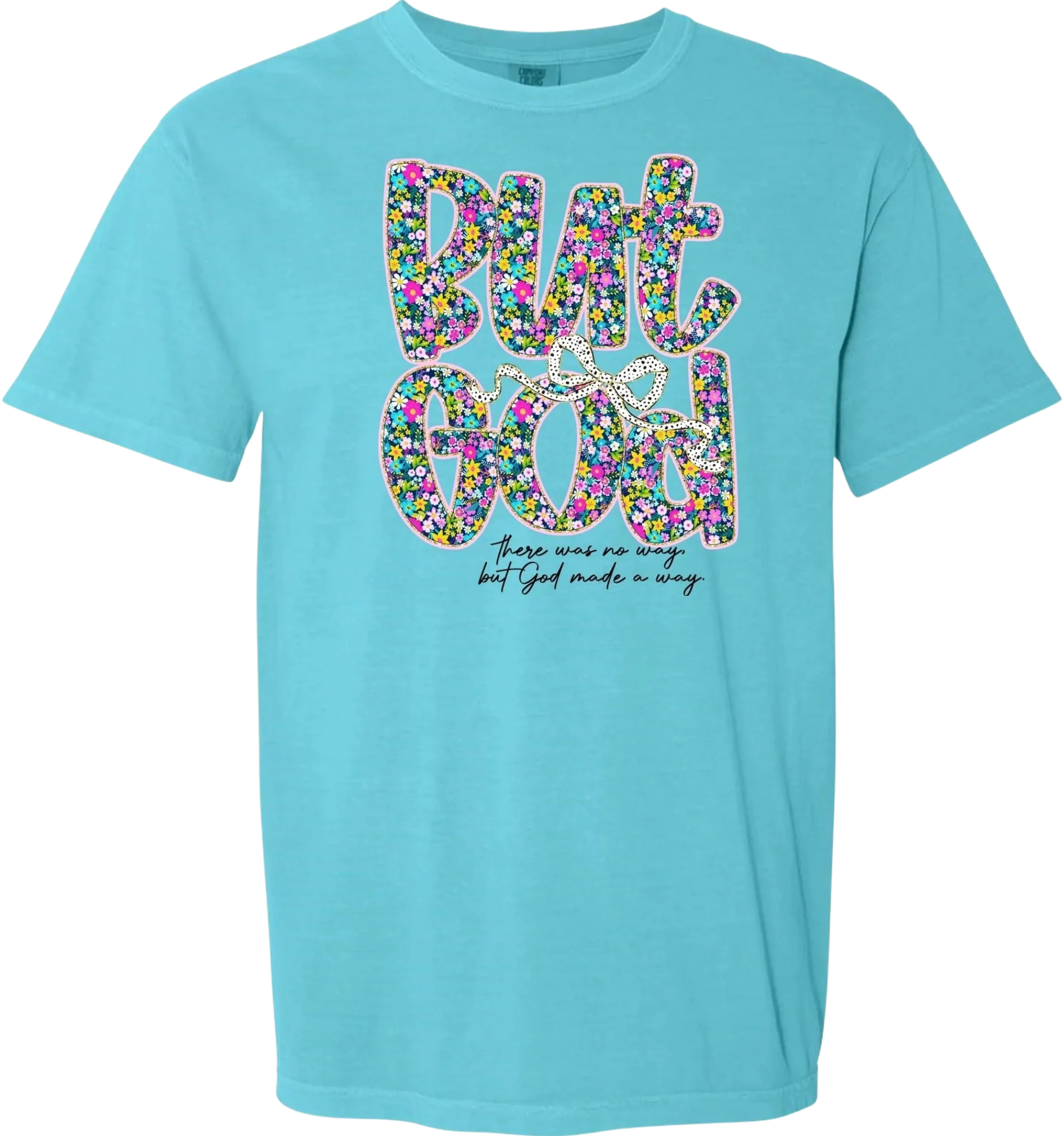When we look back in our lives we will be able to say "But God" in so many areas of our lives. Enjoy this Lagoon colored garment-dyed for that lived in feel and almost no shrinkage at home. Soft ring-spun cotton fabric with 100% cotton threads. Relaxed fit. Comfort Color