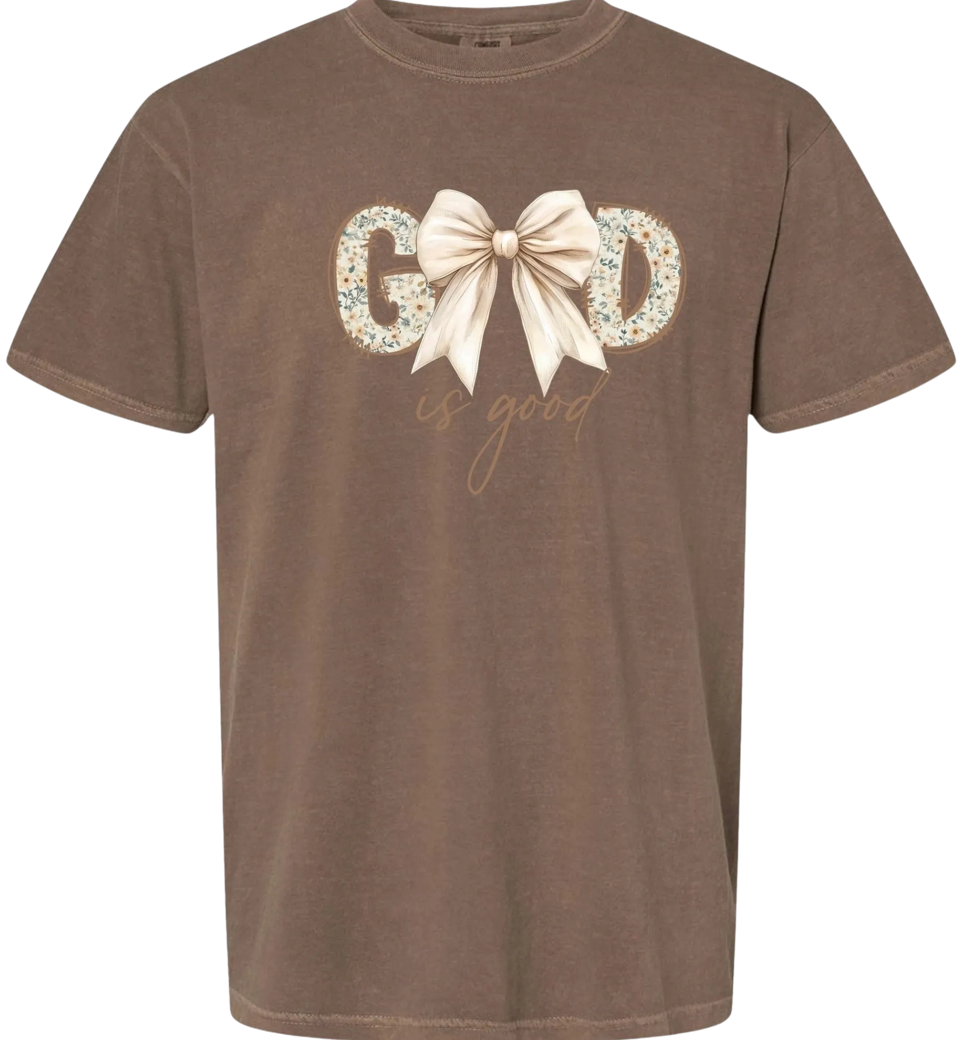 God is good with a bow on top. In expresso garment-dyed for that lived in feel and almost no shrinkage at home. Soft ring-spun cotton fabric with 100% cotton threads. Relaxed fit. Comfort Color